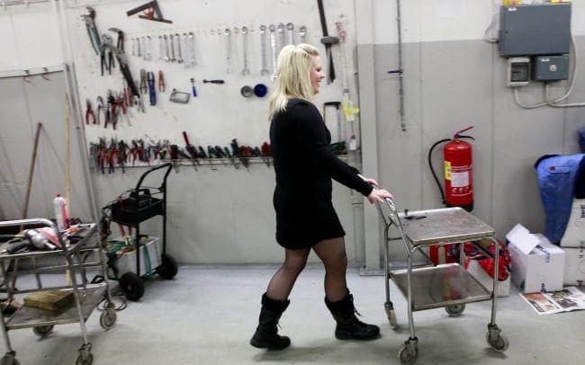 Hon är ensam kvinna på jobbet och trivs med det. Snacket kring fikabordet handlar mycket om bilar och problemlösningar.