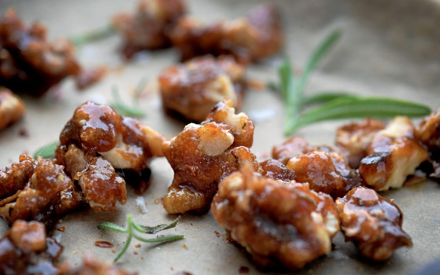 Häll sockret i en stekpanna, tillsätt smör, rosmarin, chiliflakes, kanel och lite flingsalt. Låt det sakta smälta på medelvärme. Rör om med en träslev när sockret börjar smälta och låt det få en lätt ljusbrun ton, men det ska helst inte bli mörkare än så. Tänk på att sockret blir extremt hett, akta så att du inte bränner dig.