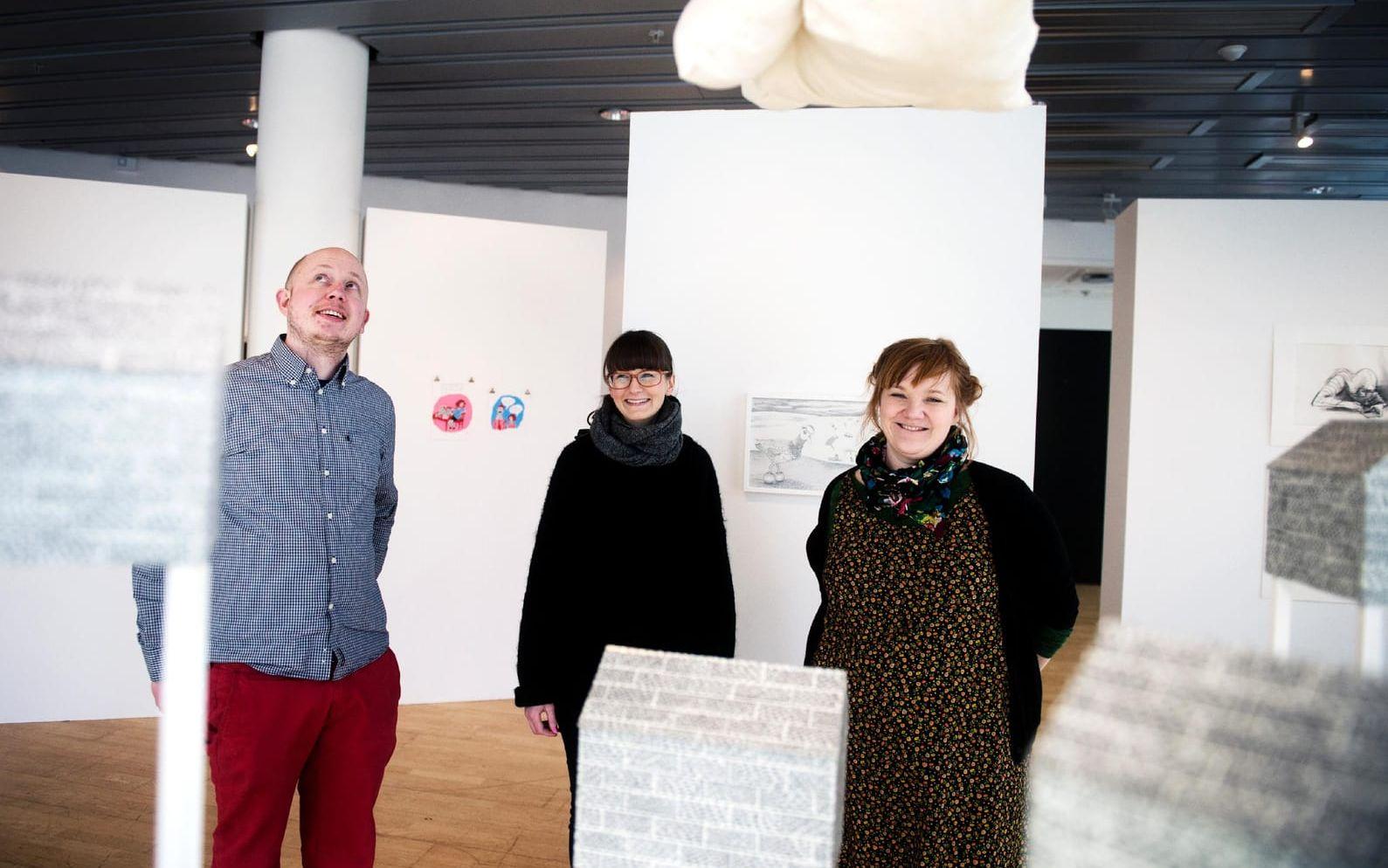 Tre av nio. Lars Bylund, Veronica Lindahl och Hanna Hallén är några av Halmstadkonstnärerna som ställer ut på konsthallen. Här står de mitt i en skulpturgrupp av Veronica Lindahl.