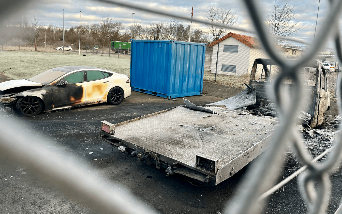 Området där bilarna stod är inhägnat. Enligt polisens uppgifter ska ett vittne ha sett någon kasta in ett brinnande föremål över staketet.