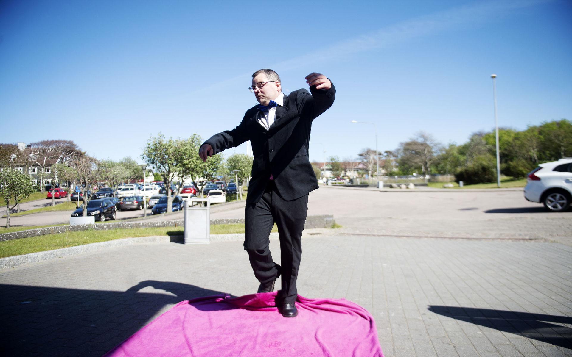 För känslans skull försöker jag ändå simulera att kavajen fastnar i bildörren. Sedan slänger vi ut en rödaktig filt så att jag ska få testa att snubbla på den där mattan – detta är nämligen sådant som riktiga studenter brukar oroa sig över. Skrattar måsarna? Eller är det inbillning?