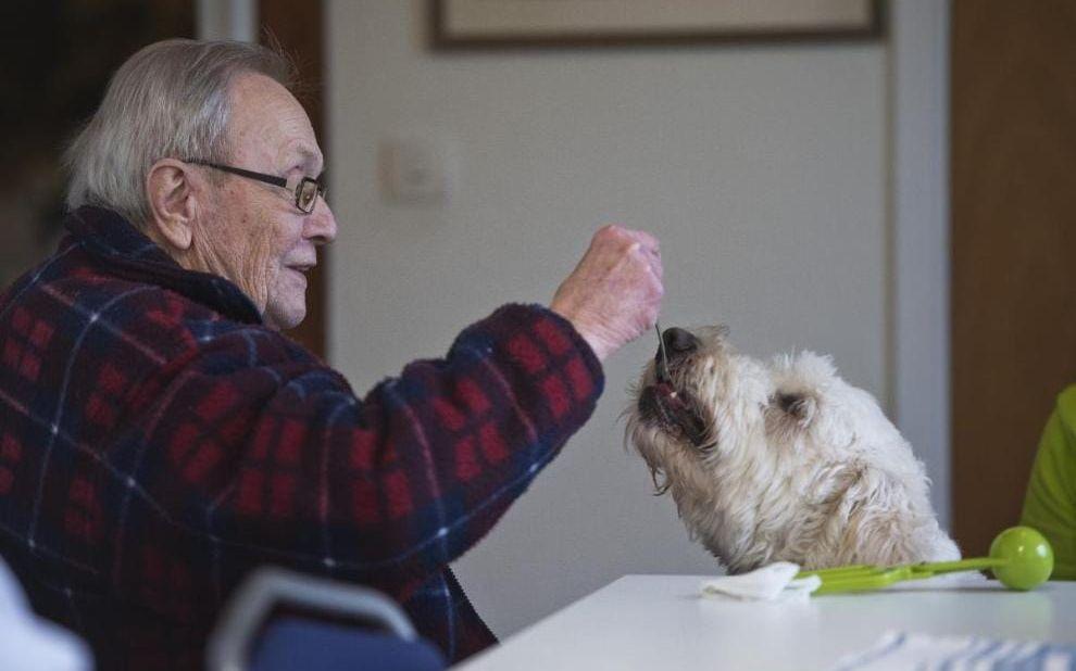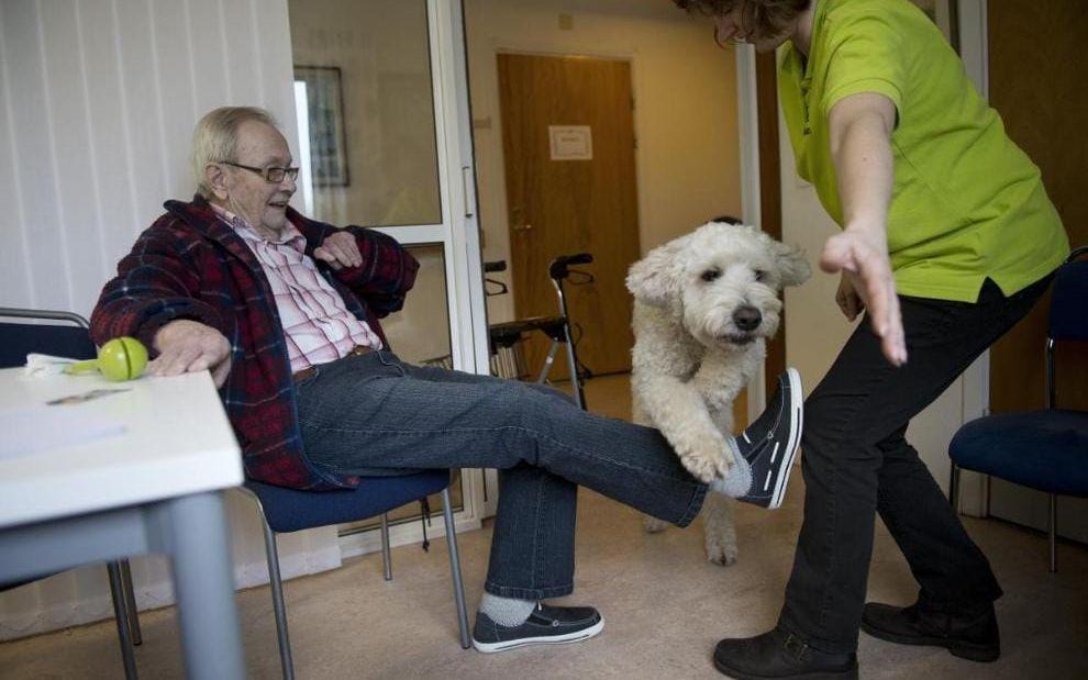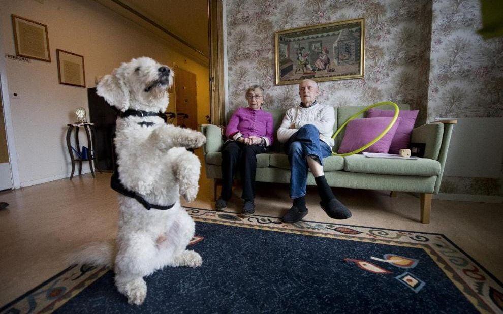 Charlie kan förstås sitta vackert, han kan ge vacker tass, han kan nosa fram godsaker under burkar och en hel massa andra finurligheter. Men inga konster och inga trix utan hjälp av pensionärerna. De får mata, lägga godis på tassen eller lyfta på benen för att agera hinder. På så vis kan man träna finmotorik, balans, tal eller socialt samspel. Allt utifrån vad den boende har störst behov av. Ibland tränar man tillsammans, ibland en och en.