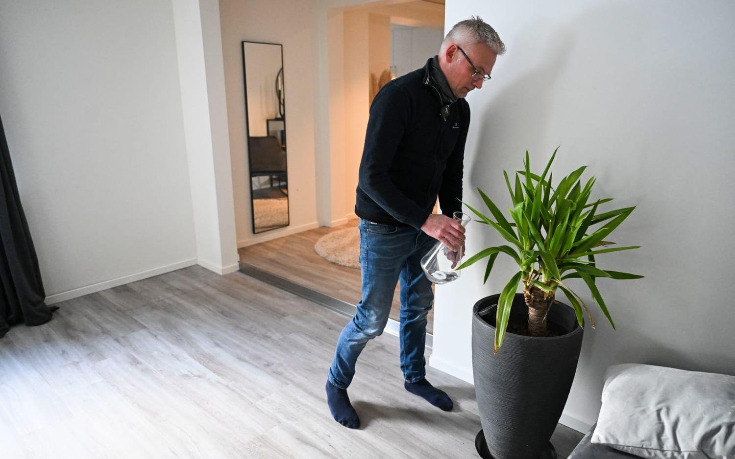 Även om det nu har gått nästan fyra månader sedan Jeanette dog kör han ofta inom hennes lägenhet. Från ett svart vitrinskåp hämtar han en glaskaraff och börjar med van hand vattna krukväxterna.