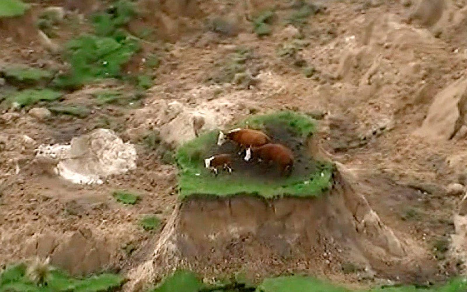 Tre kor står strandade sedan marken runt dem försvunnit efter ett jordskred till följd av de kraftiga jordskalven i Nya Zeeland.